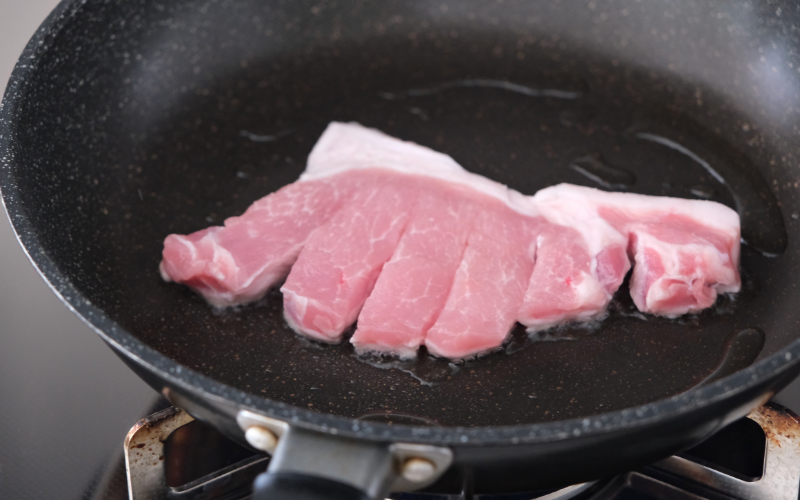 2.フライパンに油を中火で熱し、1の豚肉を入れて両面に焼き色がつくまで4〜5分焼く。