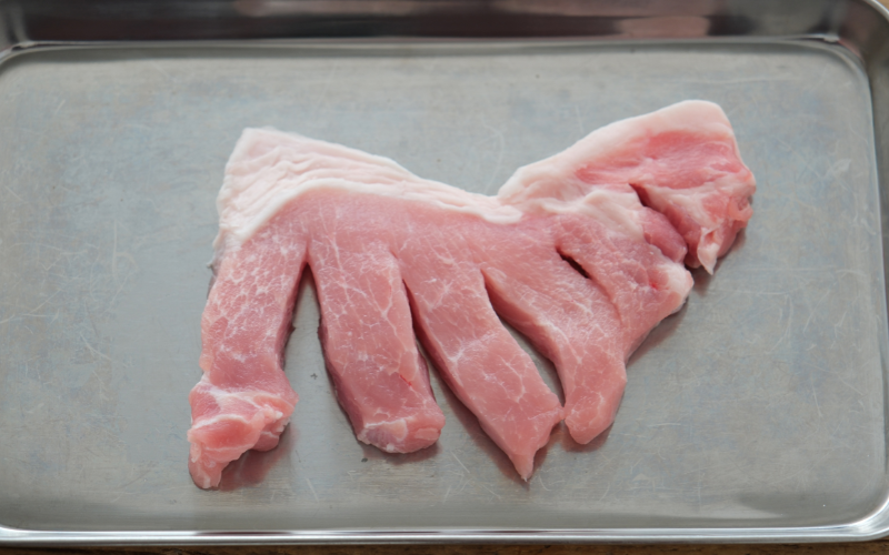 1.豚ロース肉は切り込みを入れてグローブのような形にする。