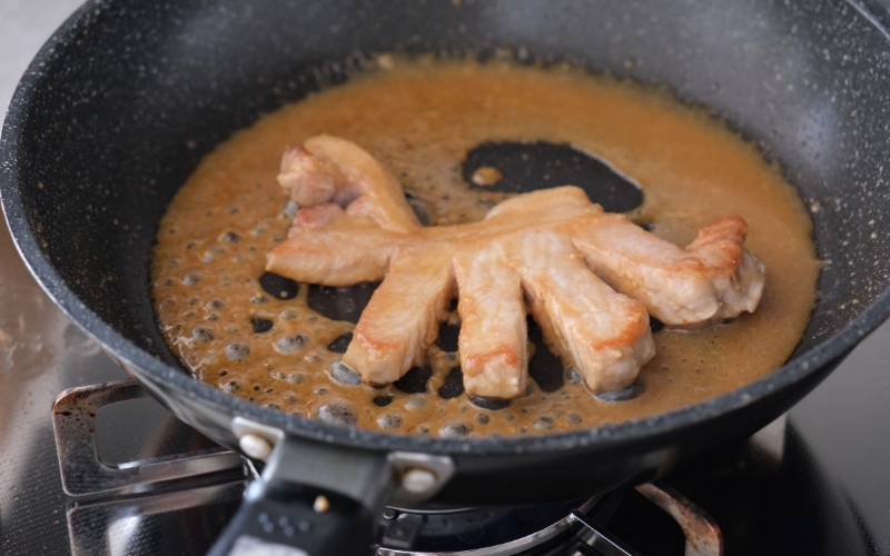 味噌が入ったタレは強火で加熱すると焦げやすいので弱めの中火~中火の火加減で加熱してください。煮詰まってくるとソースの色が濃くなって香ばしさがプラスされます。