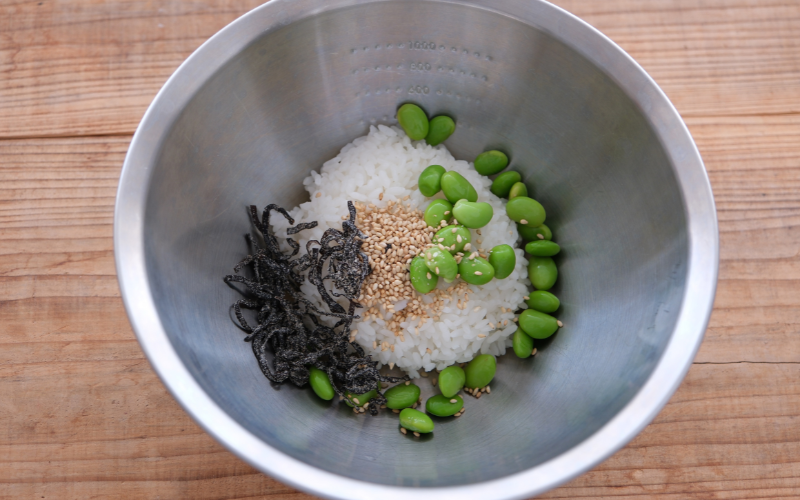 2.ボウルに炊いたご飯、枝豆、塩昆布、いりごまを入れたらしっかり混ぜて、ラップで優しくにぎる。