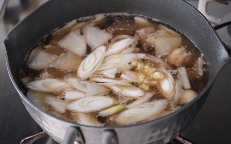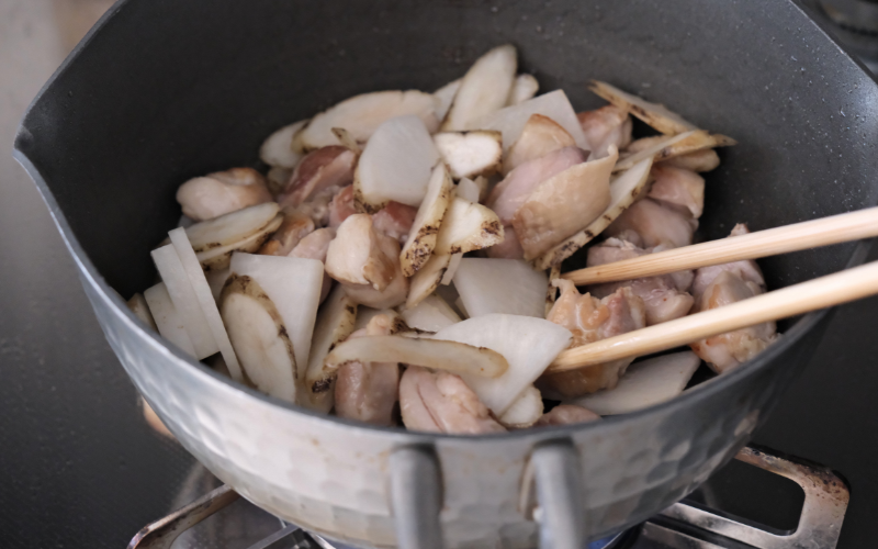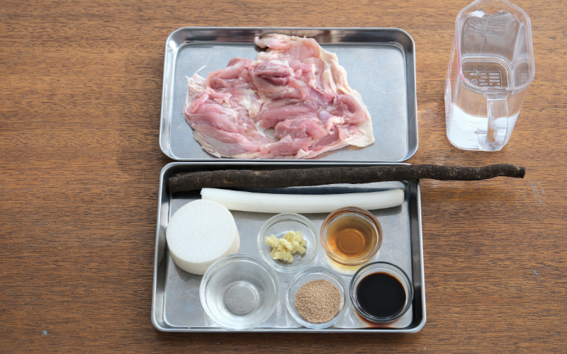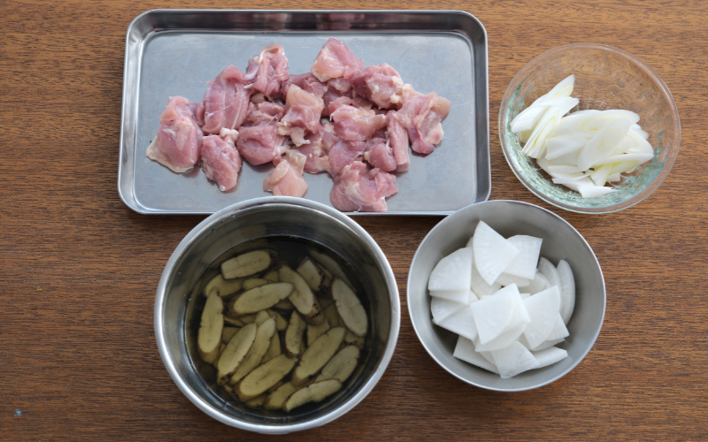 1.鶏もも肉はひと口大に切る。大根は皮を剥いたら、厚さ2mmほどのいちょう切りにする。ねぎとごぼうは2mm厚さほどの斜め薄切りにする。