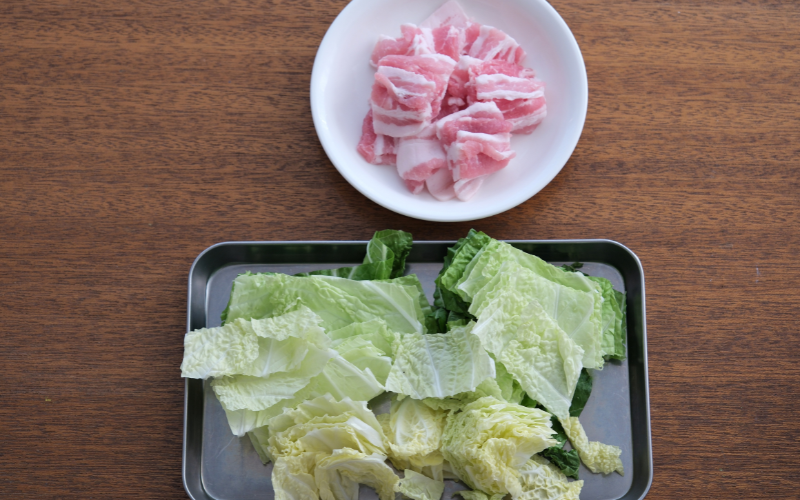 1.豚ばら薄切り肉は4cm長さほどの食べやすい大きさに切る。白菜は4cm幅程度に切る。