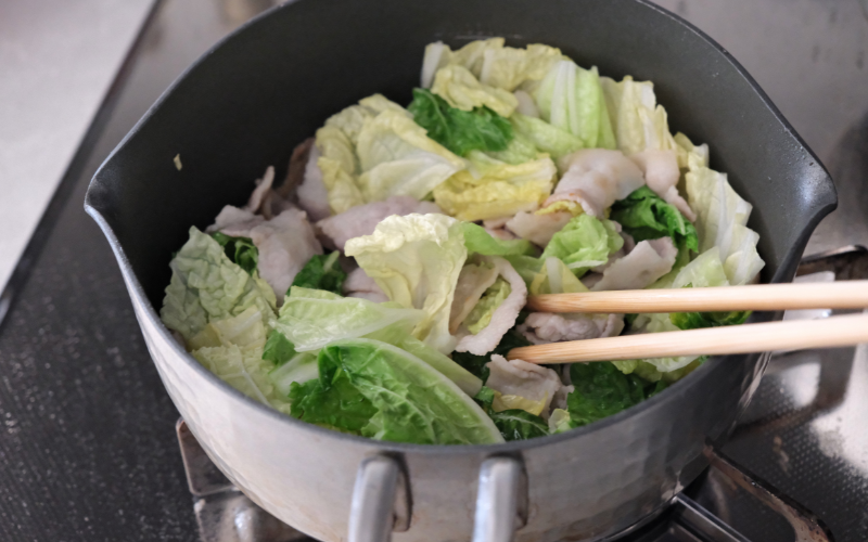 今回白菜は葉先の柔らかい部分を使用しましたが、芯の部分を使用しても美味しく作ることができます。